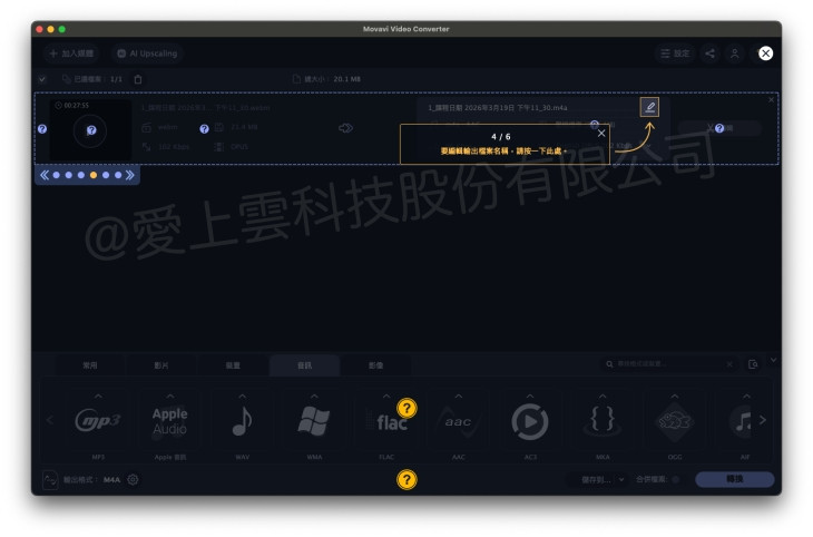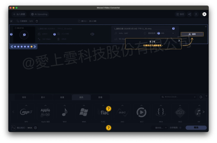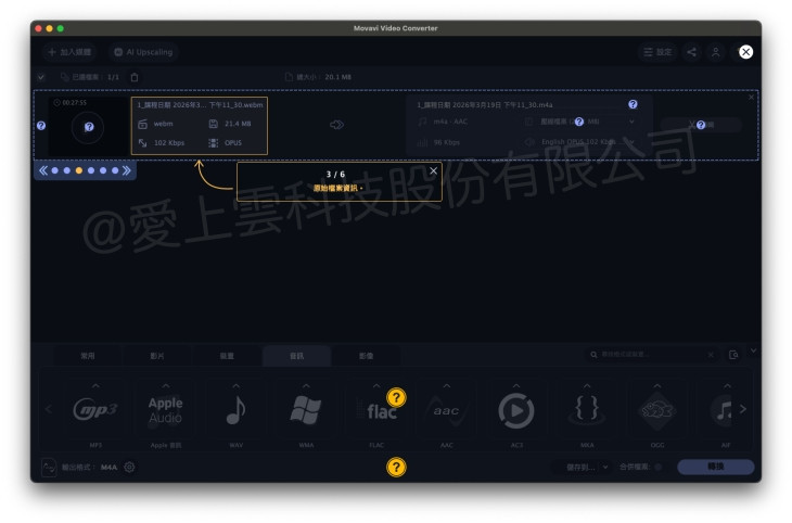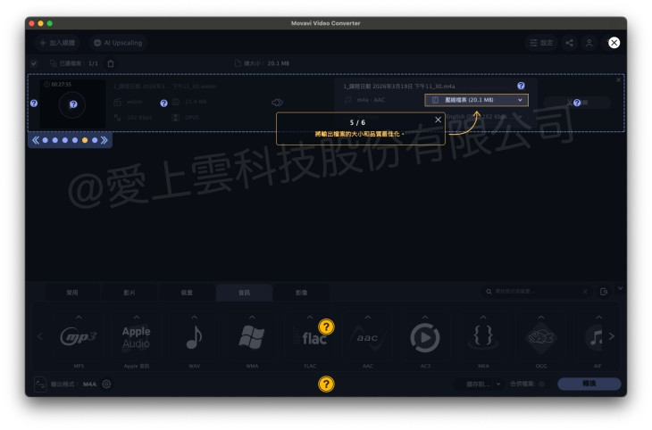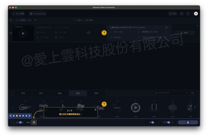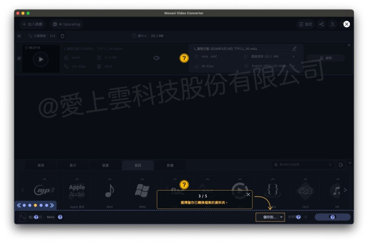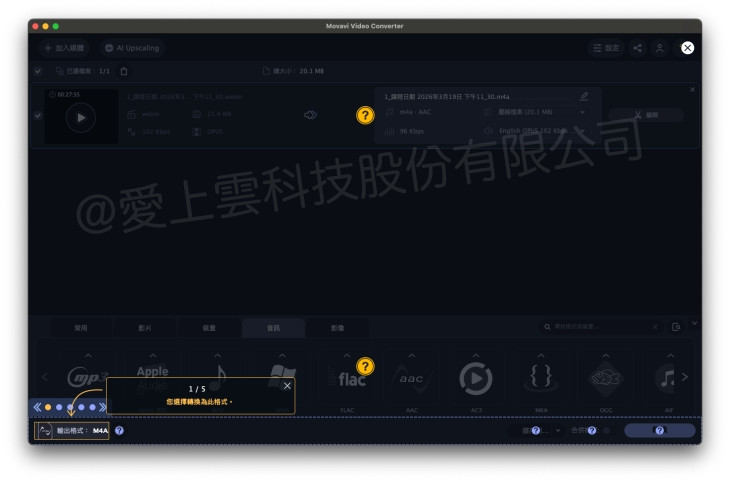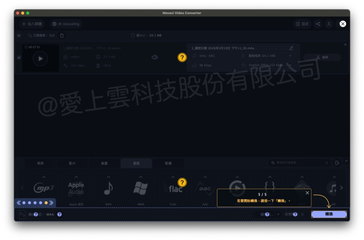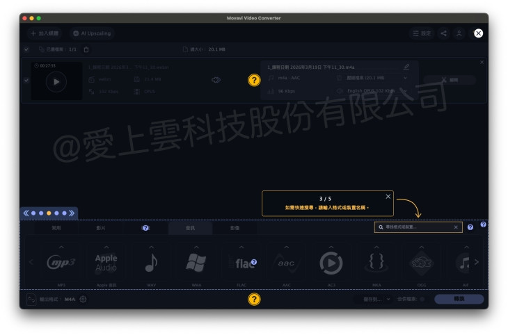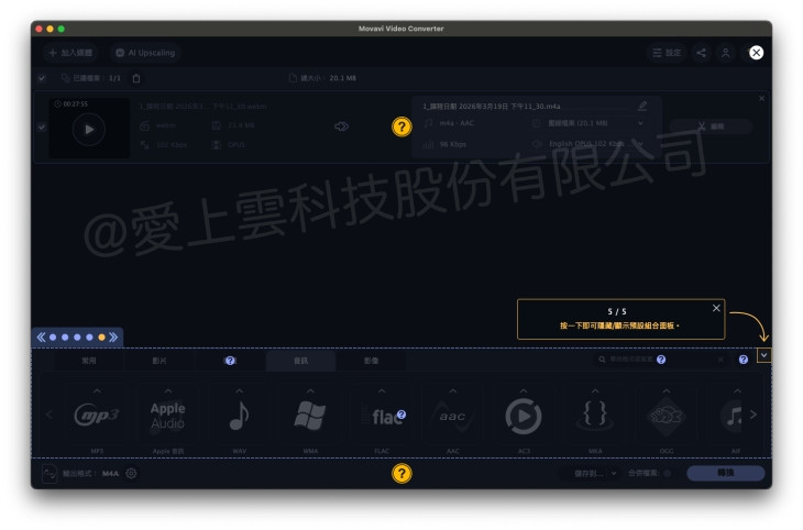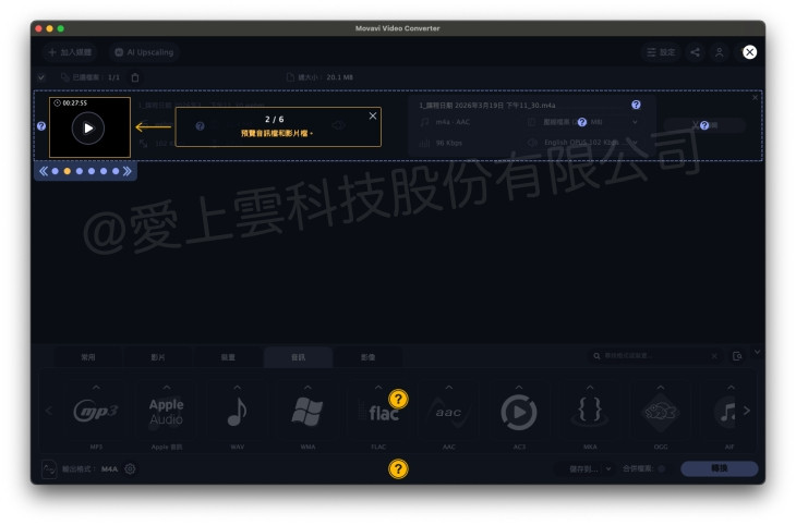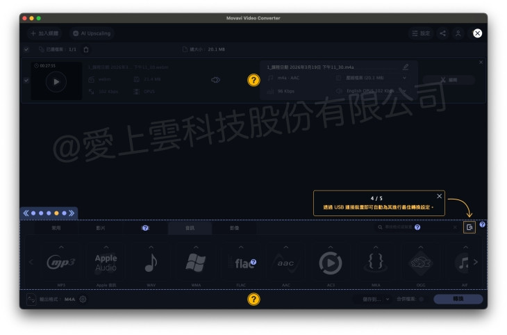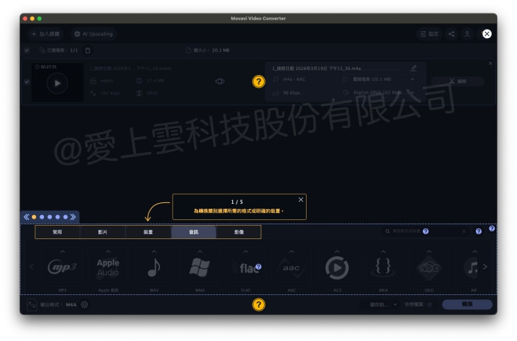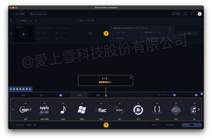 - 音訊格式可在轉檔時選擇 AAC、MP3 等輸出格式